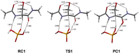The geometries of RC1, TS1 (transition state of pathway 1), and PC1 (product complex of pathway 1) are shown in Figure 4. In RC1, the model compound and the H2PO4− ion form a complex by two hydrogen bonds and a CH–O interaction. The CH–O interaction (2.003 Å) involves the Ser Cα–Hα bond and one of the deprotonated oxygens in H2PO4−. The H2PO4− ion also forms a hydrogen bond (1.960 Å) to the Ser carbonyl oxygen. The additional hydrogen bond (1.873 Å) involving the Ser NH group may also contribute to stabilizing RC1. It should be noted that the H2PO4− ion in RC1 is in a pseudo-C2 symmetry, corresponding to the global minimum geometry of an isolated H2PO4− ion of C2 symmetry [51,52,53,54].
