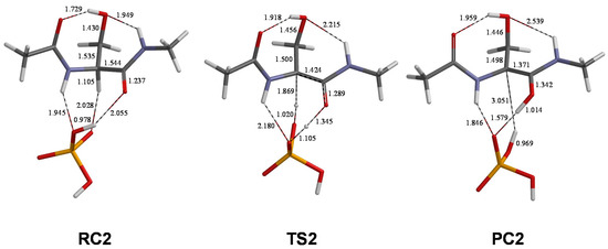 The geometries of RC2 (reactant complex of pathway 2), TS2 (transition state of pathway 2), and PC2 (product complex of pathway 2). Selected interatomic distances are shown in Å. Grey: carbon; white: hydrogen; blue: nitrogen; red: oxygen; orange: phosphorus.