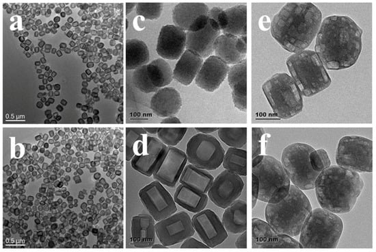 Another route to prepare hollow ZSM-5 zeolite is to selectively dissolve silicon components with alkali solution. When ZSM-5 zeolite is prepared with the assistance of organic structure-directing agent, the aluminum and silicon distribute heterogeneously, with aluminum rich surface and silicon rich core. Thus, the silicon rich core is preferentially dissolved by alkali solution to generate hollow structure. Hollow structural ZSM-5 zeolite was obtained by sodium hydroxide solution treatment by Groen et al. [33]. The shell of this hollow ZSM-5 zeolite was heterogeneous due to the non-uniformity of the precursor and/or the severe dissolution of the zeolite crystals by the sodium hydroxide solution. When the crystal size of ZSM-5 zeolite was below 100 nm, it was feasible to obtain hollow zeolite with uniform shell thickness [21]. Xie et al. [20] prepared the regular ZSM-5 microboxes through sodium carbonate treatment, which was a milder method than sodium hydroxide treatment. Guo et al. [22] prepared hollow ZSM-5 single crystals by hydrothermal treatment in tetrapropylammonium hydroxide solution (TPAOH). The silicon in the interior of the zeolite was selectively dissolved and recrystallized on the exterior. They also proved that this post-treatment method was only effective on zeolites with Si/Al ratio ranged from 40 to 74 and the nanocrystal size ranged from 150 to 330 nm (Figure 2). It indicated that the selective dissolution of silicon components was limited to specific Si/Al ratio and nano-sized zeolites. Besides, it was wasteful in industrial application, because much aluminosilicate was dissolved.