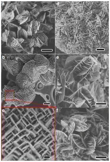 SEM images of as-made samples: BCPh-4-6-6 (a); BCPh-6-6-6 (b,c); BCPh-8-6-6 (d); BCPh-10-6-6 (e); and BCPh-12-6-6 (f), all showing the formation of single-crystalline zeolite nanosheets with 90 °C rotational boundary. The scale bars in (a–f) represent 1 mm, 500 nm, 100 nm, 500 nm, 1 mm and 1 mm, respectively [42]. Copyright Nature Publishing Group, 2014.
