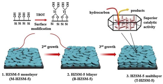 The straight channel along b axis has been considered as the fast diffusion pathway due to the straight and short transport path [57]. The catalytic activity of b-oriented MFI zeolite was enhanced sharply when it was applied in the supercritical catalytic cracking of hydrocarbon due to ultrashort diffusion path [58]. Therefore, much attention has been attracted to prepare the MFI zeolite grown only along the b-axis to decrease the diffusion length. However, most of the related studies were to prepare the b-oriented MFI zeolite without aluminum atoms [59,60,61]. It is of great challenge to prepare b-oriented MFI zeolite containing aluminum atoms for catalytic reactions, for the difficulty on effectively controlling the growth orientation with the co-existence of silicon and aluminum atoms. Besides, it is difficult to control the b-orientation of MFI crystals in a bi- or multi-layer. A layer by layer method was developed to prepare the multilayer b-oriented ZSM-5 coatings on stainless steel slides by surface modification with TiO2 sols for catalytic cracking of n-dodecane (Figure 6) [57]. The hydroxyl groups (Ti-OH) could facilitate the directional growth. Therefore, the ZSM-5 monolayer grew along the b axis with the guidance of TiO2 layer during hydrothermal treatment process. Similar process was conducted several times to obtain enough mass of b-oriented ZSM-5 layers. The catalytic activity of n-dodecane cracking over b-oriented ZSM-5 layers increased more than 60% and the deactivation rate decreased from 17.3% to 2.3% due to the enhanced diffusion rate in b-oriented ZSM-5 zeolite. Overall, synthesis of b-oriented MFI zeolite is still in laboratory scale, and it is difficult to directly control the crystal growth.