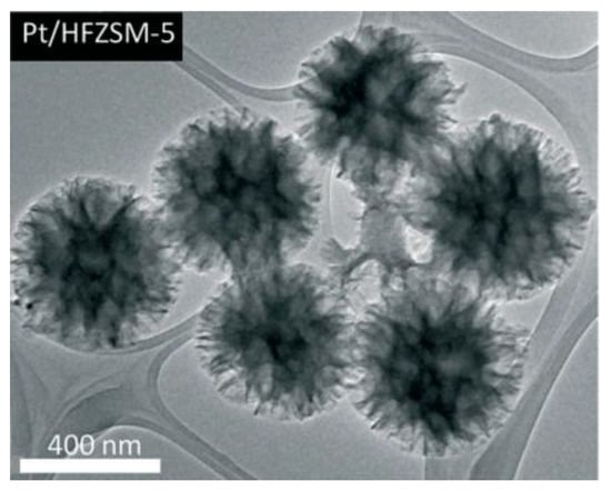 Besides, the nanosheet zeolite could act as an excellent supporter for loading metal nanoparticles to develop a multifunctional zeolite catalyst. It provides larger surface area to support the metal nanoparticles, thus the nanoparticles could uniformly distribute within zeolite crystals and prevent the aggregation among metal nanoparticles with the increase of loading amount. While for conventional ZSM-5 zeolite, they are only supported on the external surface, and it is easy to aggregate resulting in the decrease of BET surface area or the blockage of pore channel [48].