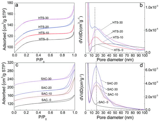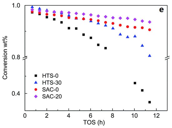 N2 adsorption–desorption isothermals and pore size distribution of calcined HZSM-5: (a,b) HTS method; and (c,d) SAC method; and (e) conversion of n-decane cracking over HZSM-5 as a function of TOS. HTS-x or SAC-x, “x” denotes the percentage of mass ratio of CNTs to TEOS [71]. Copyright Royal Society of Chemistry, 2015.