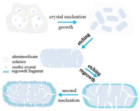 To avoid the suppression reaction between two different templates during the crystal growth and decrease the preparation cost, many studies have been conducted to prepare hierarchical ZSM-5 zeolite with single template. Wu et al. [74] prepared mesoporous ZSM-5 microspheres using n-hexylamine as the template. With the direction induction of n-hexylamine, small crystals generated and assembled to uniform cauliflower-like microspheres successively. Besides, the average diameter of the mesoporous zeolite could be effectively regulated by adjusting the alkalinity of the preparation solution. The mesoporous ZSM-5 zeolites with improved diffusion efficiency and acids accessibility showed better performance than the conventional ZSM-5 zeolite. TPAOH, a conventional microporous template, can be used as the single SDA to prepare hierarchical ZSM-5 zeolite [75,76]. Hua et al. [76] successfully prepared the hierarchical ZSM-5 zeolite using only TPAOH as the SDA through one-step hydrothermal process at a relatively low temperature of 100 °C, and they proposed a “nucleation/growth-demetallation/recrystallization” mechanism during the hydrothermal synthesis process. Initially, the precursor species nucleated and grew under the protection of aluminum complexes and TPA+ cations. Then basic etching became obvious with the consumption of aluminum complexes and TPA+ cations, resulting in the mesoporous structure. Finally, the dissolved species recrystallized and grew on the external surface of the zeolite crystals (Figure 11). During the catalytic cracking of 1, 3, 5-triisopropylbenzene (TIPB), the hierarchical ZSM-5 zeolite showed conversion rate of 80% with little carbon deposition, while that of the conventional ZSM-5 was only 55% with much more carbon deposition.