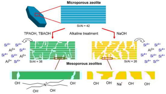 - Groen, J.C.; Moulijn, J.A.; Pérez-Ramírez, J. Desilication: On the controlled generation of mesoporosity in MFI zeolites. J. Mater. Chem. 2006, 16, 2121–2131. [Google Scholar] [CrossRef]