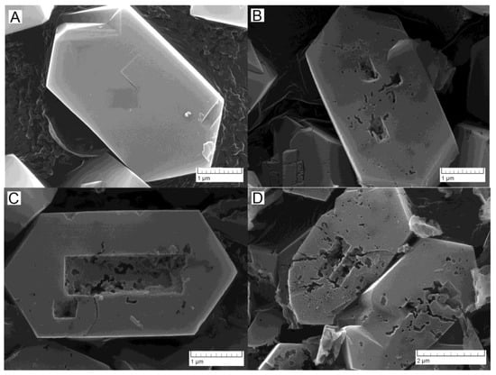SEM images of ZSM-5 crystals treated by NH4F-HF solutions at 293 K. The NH4F-HF solutions contain different amounts of HF (0.05, 0.1, and 0.5 mol·L−1) and a constant amount of NH4F (2.5 g per 15 mL solution): (A) treated by a 0.05 mol·L−1 solution for 30 s; (B) treated by a 0.1 mol·L−1 solution for 30 s; (C) treated by a 0.5 mol·L−1 solution for 10 s; and (D) treated by a 0.5 mol·L−1 solution for 30 s [95]. Copyright American Chemical Society, 2013.