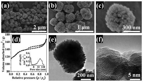 Hydrothermal method is the most widely used process to prepare nano-sized ZSM-5 zeolite. The amount of water, pre-aging time and pre-aging temperature are closely related to the crystal size. Usually, the zeolite crystal size decreases with the increase of pre-aging time and pre-aging temperature, which could facilitate nucleation of nanocrystals in the pre-aging stage. The nano-sized ZSM-5 zeolites showed a better catalytic activity, a longer lifetime and less carbon deposition compared with large-sized ZSM-5 zeolite during n-hexane cracking [98]. ZSM-5 zeolite with uniform size of 30 nm was prepared by pre-aging at low temperature (80 °C) and then high temperature hydrothermal treatment (175 °C) [109]. The concentration of initial synthesis gel facilitated the generation of nucleation centers. At pre-aging stage, the number of critical sized nuclei increased. Finally, the high temperature promoted the complete growth of crystals. Wang et al. [105] developed a facile route to prepare nano-sized ZSM-5 zeolite using silicate-1 as seeds with the assistance of CTAB. The seeds induced the aluminosilicates into ZSM-5 phase on their surface. While CTAB could restrain the intergrowth and secondary growth of crystal nucleus, thus large number of nanocrystals formed and assembled into zeolite aggregates. The prepared ZSM-5 zeolites showed a uniform morphology with 400–600 nm, aggregation with 20–50 nm crystals, a large external surface area (273 m2·g−1) and large mesopore volume (0.31 cm3·g−1) (Figure 14). Besides, if there is no metal cation in the synthesis gel, the proton formed ZSM-5 zeolite can be directly obtained simply by calcining the products after hydrothermal treatment without ion exchange with NH4NO3 [87]. It was a time-saving and energy-saving procedure.