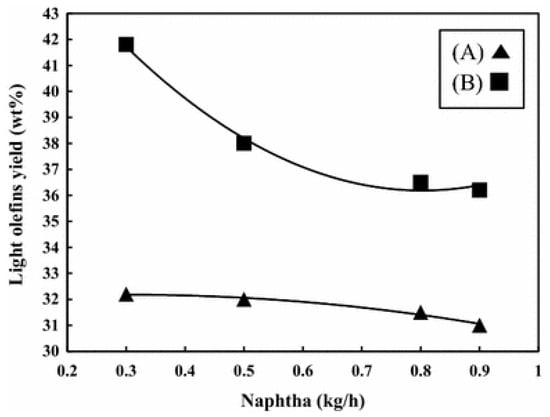 Light olefins yield depending on the naphtha feed rate in fluidized catalytic cracking over steamed micro-spherical catalyst prepared with: (A) commercial ZSM-5 (filled triangle); and (B) ZSM-5 synthesized with crystalline seed (filled square) (reaction condition: naphtha/steam ratio (wt/wt) = 4, contact time = 2 s, catalyst/oil = 50, reactor temperature = 680 °C, regeneration temperature = 720 °C) [106]. Copyright Springer, 2016.