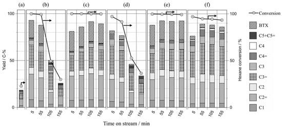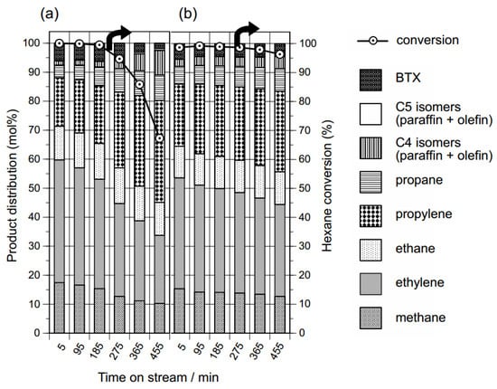 - Inagaki, S.; Shinoda, S.; Kaneko, Y.; Takechi, K.; Komatsu, R.; Tsuboi, Y.; Yamazaki, H.; Kondo, J.N.; Kubota, Y. Facile fabrication of ZSM-5 zeolite catalyst with high durability to coke formation during catalytic cracking of paraffins. ACS Catal. 2013, 3, 74–78. [Google Scholar] [CrossRef]