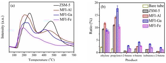 Zeolites are crystalline aluminosilicate fabricated by silica tetrahedron and alumina tetrahedron through oxygen bridges. They are widely applied in petrochemical chemistry [1,2], environmental protection [3,4] and adsorption [5] because of high BET (Brunauer-Emmett-Teller) surface area, special channel structure, abundant acid sites, and thermal and hydrothermal stability [6]. Catalytic cracking of hydrocarbon is significant for industrial manufacture, due to the advantages of high cracking conversion efficiency, high light alkene selectivity and less carbon deposition compared with thermal cracking [7]. Among the catalysts for hydrocarbon catalytic cracking, ZSM-5 zeolite is the most widely used due to its particular advantages of its acidity, special pore structure, and high thermal and hydrothermal stability [8,9]. When it was applied in n-hexane cracking under high pressure, it showed better catalytic activity and stability, higher light alkene selectivity and less sensitivity to deactivation by carbon deposition than H-MOR, H-BEA and USY zeolites [10].