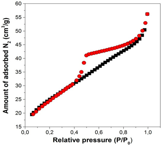 N2 adsorption–desorption isotherm of ReS2/C nanolayers. Black squares indicate adsorption and the red circles desorption.