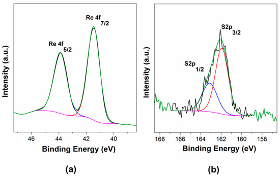 The chemical state of the ReS2/C composite was investigated by X-ray photoelectron spectroscopy (XPS). Figure 3a,b shows XPS spectra of ReS2 concerning core level electrons of rhenium (Re 4f) and sulfur (S2p), respectively. Figure 3a shows two Re 4f peaks at 41.4 eV and 43.8 eV, corresponding to the core levels 4f7/2 and 4f5/2 respectively for Re+4. Figure 3b shows two S2p characteristic peaks located at 161.8 eV and 163.0 eV, ascribed respectively to the core levels 2p3/2 and 2p1/2 of S−2 [28,35]. Also, the S/Re atomic ratio obtained by XPS was about 1.8, indicating the formation of sulfur-deficient ReS2−x layers, which is consistent with the energy-dispersive X-ray spectroscopy (EDS) spectrum analysis (Figure S1). The elemental composition of the ReS2/C sample was determined by EDS and is listed in the Table S1, where it can be observed that the composite contained Re, S, C and O. The calculated S/Re and C/Re atomic ratios were 1.79 and 3.62, respectively. The carbon element was provided by the decomposition of the tetraoctylammonium cation during the hydrothermal process and further annealing. The oxygen element observed in the analysis was from the amorphous carbon, which was not reduced completely during the annealing at 400 °C.