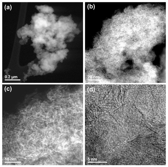 The morphological and microstructure features of the ReS2/C sample annealed at 400 °C were investigated by scanning transmission electron microscopy (STEM). The high-angle annular dark-field (HAADF) and bright-field scanning transmission electron microscopy (BF-STEM) images of the material are shown in Figure 4a,b, respectively. Figure 4a gives a general view of a grain, consisting of large fluffy zones; a magnification of one of these fluffy arrangements (Figure 4b) shows a particle-rich zone, containing randomly-orientated ReS2 layers. The amorphous carbon dispersant matrix can be detected in Figure 4c, where the bright atom contrast arises from the ReS2 layers, while carbon atoms show lower contrast. The small average lateral sizes (4.22 ± 1.39 nm) and low stacking (1–2 stacked layers) of the ReS2 layers observed in the present product are similar to those in ReS2 composites obtained by the sulfidization of tetraalkylammonium perrhenate salts [25]. The small and randomly-orientated ReS2 layers shown in the STEM images (Figure 4c,d), correspond with the absence of the (002) plane, as well as with the XRD broadened reflection described above.