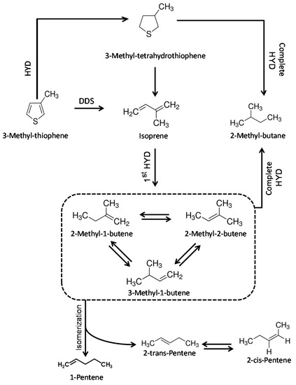 Reaction path network for the 3-methyl-thiophene hydrodesulfurization. DDS: desulfurization; HYD: hydrogenation.