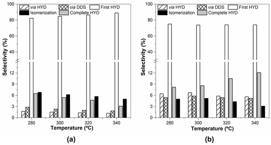 The selectivity data taken at a 3MT conversion of 20–25% for ReS2/C and the reference catalyst are shown in Figure 6. It can be noted that the principal product observed over both catalysts was the mixed olefins compounds (3M1B, 2M1B, and 2M2B), which were obtained via the first hydrogenation pathway from isoprene transformation. The formation of olefin compounds was higher over the ReS2/C than over the molybdenum reference catalyst. One can even notice an important change in the fraction of olefin formation with the temperature increase (from 80 up to 89%). Conversely, the formation of mixed olefin over the reference sulfided CoMo/γ-Al2O3 catalyst remains close to 75%, being largely independent of the temperature change. The highest fraction of isoprene and 3MTHT selectivity (DDS and HYD pathways, respectively) were observed over the CoMo-based catalyst. In both samples (Re- and CoMo-based catalysts), the fraction of these compounds formed slightly decreased as the temperature increased, and their decrement was similar in both samples. This was expected to occur, because the thermodynamic stability of these products adsorbed on the catalyst surface should be lower at higher temperatures. The selectivity of the products obtained by isomerization steps (mix of pentenes) significantly decreased with a rise of temperature in both catalysts. In addition, the selectivity of the products of the complete hydrogenation step (2MB) decreased over the ReS2/C catalyst and increased in the reference catalyst as the temperature increased.