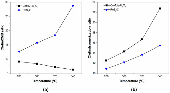 In order to understand the isomerization and hydrogenation abilities of both catalysts, the ratios of selectivity of Olefin/2MB and Olefin/Isomerization versus the reaction temperature were calculated from the same 3MT conversion (20–25%) (Figure 7). There was a notable difference between the Olefin/2MB ratio for both catalysts, as can be seen in Figure 7a, where one can see a marked increase of the ReS2/C selectivity to olefin formation as the reaction temperature increases. The opposite was observed for the CoMo-based catalyst. In the case of the relationship between olefin/isomerization ratio and the temperature reaction, a similar trend can be seen for Re- and CoMo-based catalysts (Figure 7b). The comparatively higher catalytic performance of the Re-based catalyst in the hydrodesulfurization of 3MT, in comparison to that of a supported Mo catalyst promoted by cobalt (CoMo/γ-Al2O3), may have arisen from the presence of a non-stoichiometric sulfur species (ReS2−x) in the synthesized composite, in the absence of stacking along the c-axis, and in the ultra-small basal planes, which offer a higher proportion of structural sulfur defects at the edge of the layers. These sulfur defects are critical for hydrodesulfurization catalytic processes. The high yield of olefins obtained with the Re-based catalyst, in comparison with the reference catalyst, may have arisen from the presence of more than one active site, involving HYD and DDS reactions, according to the rim-edge catalytic model [36]. These results indicate that the low hydrogenation ability of the ReS2 catalyst, in comparison with the promoted CoMo catalyst, as well as the comparatively high olefin formation produced by the ReS2/C composite catalyst, may favor the production of gasolines with a greater octane number.