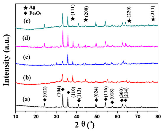 XRD patterns of Fe2O3 [30] and Ag catalysts with different preparation methods: (a) Fe2O3 [30]; (b) Ag–Fe; (c) Ag–MIL; (d) Ag–Fe2O3; (e) Ag–PB.