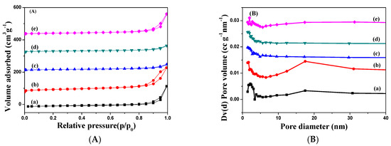 As a first observation, compared with the pure Fe2O3 catalyst, the pore size of Ag–Fe lies mainly in the range of 1.5–4 nm and 12–25 nm, indicating that the catalyst produced by this method can produce many large pores, which results in an increase of BET surface areas from 27 to 68 m2 g−1. The relatively high surface area might be attributed to the decomposition of nitrates (AgNO3) and organic ligands (MIL-100 (Fe)) simultaneously during preprocessing; a lot of pores are formed in the formation of gases. However, for Ag–MIL, Ag–Fe2O3, and Ag–PB, the surface areas and pore diameters decreased with the additional Ag component, which is consistent with most literature reports [50,51].