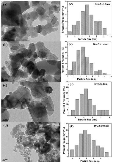 The dispersion of noble metal can be significantly affected by the preparation process, implying the diversity in the size distribution of the noble metal particles, which can be confirmed by the TEM images (Figure 3). In the TEM images, highly dispersed silver nanoparticles can be observed on the surface of Ag–MIL and Ag–Fe catalysts. The Ag particle size distributions established, based on the TEM images, are also presented in Figure 3. It can be seen that the mean Ag mean particle size in Ag–Fe is about 4.7 ± 1.2 nm (Figure 3a’), and the average sizes of Ag nanoparticles on Ag–MIL, Ag–Fe2O3 and Ag–PB are about 4.5 ± 1.4 nm (Figure 3b’), 5.3 ± 1 nm (Figure 3c’) and 3.8 ± 0.6 nm (Figure 3d’), respectively. The size and distribution of silver nanoparticles were further provided by TEM images, rending it possible to observe the particles with sizes lower than the results obtained using the Scherrer method.