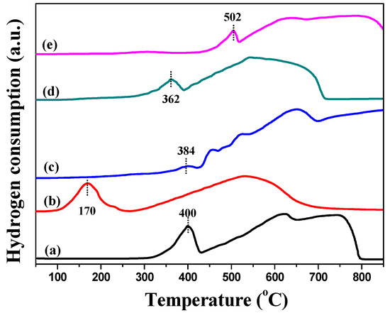 H2-temperature program reduction (H2-TPR) results of (a) Fe2O3 [30]; (b) Ag–Fe; (c) Ag–MIL; (d) Ag–Fe2O3; (e) Ag–PB.