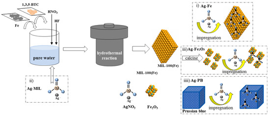 In addition, we also used three methods to prepare the Ag–Fe2O3 catalysts. (ii) The synthesis process is the same as the synthesis of MIL-100 (Fe), except that a given amount of silver is added during the agitation process before hydrothermal treatment; the final product was named as Ag-MIL. (iii) The Fe2O3 was used as the carrier, which derived from MIL-100 (Fe) with calcination for 2 h at 430 °C in a muffle furnace [30], and the silver was impregnated into the Fe2O3 as before, while the final catalyst was denoted as Ag–Fe2O3. iv) Commercial Prussian blue (C18Fe7N18) was used as the support, and the silver was loaded by the impregnation method as before which was denoted as Ag–PB. All as-prepared samples were calcined at 430 °C for 2 h in a muffle furnace and kept in a drying vessel. Before any characterization and tests, the samples were purged at 100 °C for 30 min with Ar atmosphere.