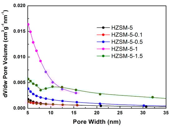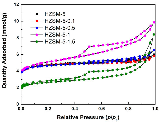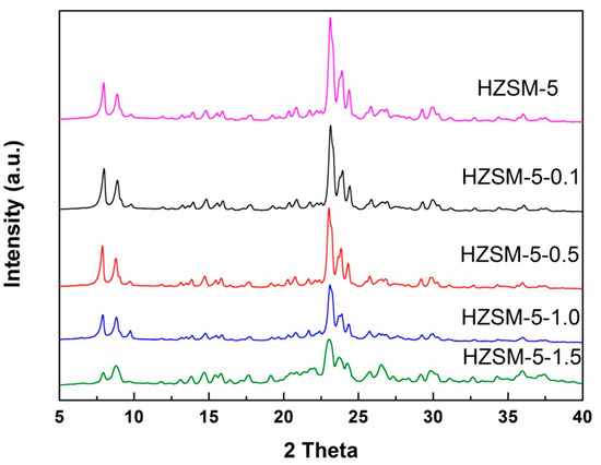 Figure 1 shows the nitrogen adsorption/desorption isotherms of NaOH-treated HZSM-5 zeolites. Table 1 lists the corresponding specific surface area, pore volume, and average pore size. The parent HZSM-5 is characterized by typical microporous material properties, with a microporous surface area of 387 m2/g and a negligible mesoporous surface area of 19 m2/g. A high adsorption capacity was achieved on initial low relative pressure (p/p0 is less than 0.01), and the isotherm then remained flat with the increase in relative pressure, indicating that the parent HZSM-5 is a microporous material with a uniform pore structure. The pore structure of HZSM-5-0.1 changed little after treatment with 0.1 M NaOH solution, while the isotherm was almost overlapped with the parent HZSM-5. The adsorption capacity of HZSM-5-0.5 increased slightly in the higher relative pressure region of the isotherm (0.4 < p/p0 < 0.85). The mesoporous surface area increased to 35 m2/g, and the corresponding microporous surface area was reduced to 371 m2/g. The pore structure of HZSM-5-1 underwent great changes. The adsorption capacity increases continuously with the relative pressure, indicating the creation of pores with a wider pore size. At the same time, a significant hysteresis loop appears in the region with relative pressure of 0.4 < p/p0 < 0.85 on the isotherm, which indicates the presence of the intracrystalline mesopores characterized by the typical type IV isotherm of mesoporous materials. At this time, the mesoporous surface area increased significantly to 126 m2/g, while the microporous surface area decreased to 300 m2/g. When the concentration of NaOH increased to 1.5 M, the adsorption capacity on the isotherm at the initial relatively low relative pressure decreased significantly (p/p0 is less than 0.01), but there was a rapid increase in the high-pressure region (p/p0 is greater than 0.85). The mesoporous surface area and microspore surface area of HZSM-5-1.5 decreased to 63 m2/g and 161 m2/g, respectively. The microporous structure was destroyed, while some of the intergranular macropores were produced.