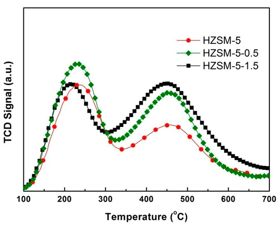 With the increase in NaOH concentration, the low temperature peak did not change. Although the desorption temperature of the high temperature peak remained essentially unchanged, the peak area gradually increased. This indicates that NaOH treatment has little effect on the strength of the Bronsted acid sites, but the Si/Al ratio increases with the desilication under alkaline conditions. The Bronsted acid sites are mainly due to the Al in the framework, so the number of Bronsted acid sites per unit mass of catalyst increases.