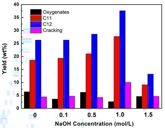 In addition, the dehydration–hydrogenation initiated by Bronsted acid function made the level of deoxygenation more obvious. Due to the high deoxygenation rate of the oxygenates, only trace amounts of aldehyde or alcohol could be detected. Dodecanal and dodecanol were present in the reaction system as key intermediate species of carboxylic acid hydrogenation. The literature reports that the dodecanal and dodecanol can be easily transformed in the equilibrium state [26]. At the same time, the cracking hydrocarbons products also increased. A large number of Bronsted acid sites catalyze the hydroisomerization and hydrocracking reaction.