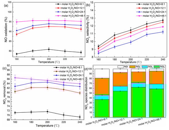 As observed in Figure 1a, for the molar H2O2/NO range from 8 to 24, the NO oxidation efficiency displayed an increasing and then a decreasing tendency with an increase in reaction temperature. The optimum NO oxidation efficiency reached at 200 °C. In contrast, the NO oxidation values for the molar H2O2/NO of 48 varied slightly with temperature and maintained a higher level than the others. NO2 selectivity (Figure 1b) was positively associated with the temperature, and the growth of NO2 at a high-temperature segment could be due to the decomposition of formed nitrates [16]. As a consequence, the total amount of NOX removal (Figure 1c) for the molar H2O2/NO range from 8 to 24 achieved a highest value at 200 °C, and showed a moderating trend along with the temperature for the molar H2O2/NO of 48. It is worth noting that the efficiency values of NO oxidation increased with an increase in the molar H2O2/NO, while the NO2 selectivity firstly increased as the molar H2O2/NO rose from 8 to 24 and then declined with a further increase of molar H2O2/NO. This phenomenon could be interpreted in two respects: (1) the increase of molar H2O2/NO implied that more H2O2 molecules participated in the reaction with NO; however, the weak oxidative capacity of H2O2 molecules could not implement a completed oxidation process of NO [17,18]; and (2) the weakening of the concentration effect for the molar H2O2/NO of 48 was mainly ascribed to the quenching of •OH; i.e., •OH radicals were depleted in the side-reaction and H2O2 was also a radical scavenger in addition to the source of •OH (Equations (3)–(6)) [19,20]. Meanwhile, the molar percentage of NO3− increased from 36.8% to 62.1% as the molar H2O2/NO rose from 8 to 24, and then dropped to 58.7% with a further increase of molar H2O2/NO (Figure 1d). This trend strengthened the abovementioned analysis.