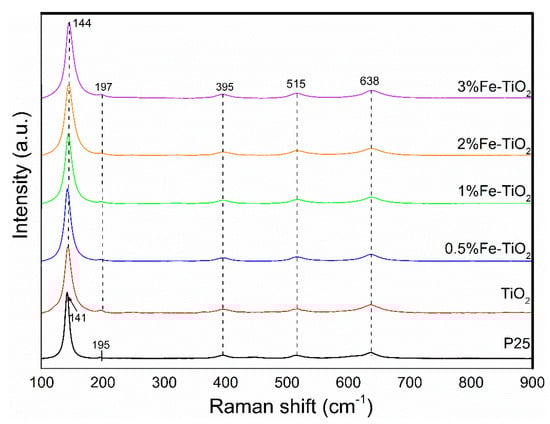 Figure 4 displays the Raman scattering spectra of the tested catalysts. The P25 and iron-doped titanium dioxides with different molar ratios (0%, 0.5%, 1%, 2%, and 3%) showed similar spectral characteristics. The observed peaks at 144 cm−1, 195 cm−1, 395 cm−1, 515 cm−1, and 638 cm−1 belong to the Raman active of TiO2 with symmetries of Eg(1), Eg(2), B1g(1), B1g(2), and Eg(3), respectively [24,25]. It should be mentioned that no Fe-relevant structures could be observed in the sample obtained above 400 °C, confirming that the Fe atom may substitute for the Ti atom and be highly dispersed in the lattice of TiO2.