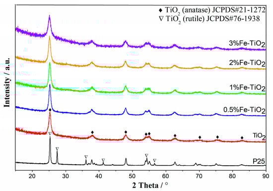 The XRD patterns of the tested catalysts are depicted in Figure 5. The P25 revealed a pattern characteristic of both a rutile and anatase phase, while the crystal structures of the doped and undoped samples prepared by the co-precipitation method were all anatase (JCPD S#21-1272). For the diffraction patterns of the Fe-doped TiO2 samples, all diffraction peaks were congruent with TiO2 and no peaks attributable to iron species could be observed in the investigated range. The possible reason was that the Fe atoms had successfully replaced Ti atoms and were incorporated into the crystal framework of the TiO2 lattice due to a similar ionic radius of Fe3+ (0.69 A) and Ti4+ (0.745 A) [28,29]. As presented in Table 1, iron species loading also impacted on the crystallite size of the samples significantly. The maximum crystallite size was found in the material with dopant concentrations of around 0.5 mol %. This phenomenon was in good agreement with the attainment, which suggested a solubility limit for Fe3+ ions in the anatase structure owing to lattice expansion that arises from compensating effects between the Fe3+ substitution of Ti4+ and oxygen vacancy formation for the maintenance of charge neutrality [30,31].