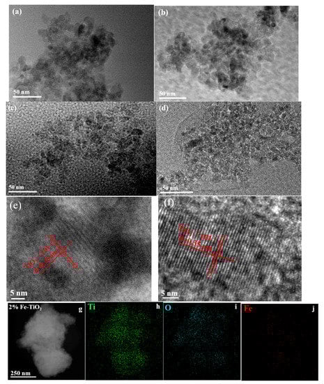 FE-SEM micrographs of undoped and doped TiO2 nanoparticles are shown in Figure S3. The average particle size of the P25 sample was significantly larger than the catalysts prepared by the co-precipitation method, and all samples revealed a fine and uniform spherical particulate structure. The morphology structures of the samples were characterized by TEM (transmission electron microscopy) and HRTEM (high resolution transmission electron microscopy). As shown in Figure 6a–d, a uniform isolated individual particle can be observed in the Fe-doped TiO2 samples. The HRTEM image of all of the Fe-TiO2 samples indicates that the obtained TiO2 particles were mainly in the anatase phase (Figure 6e,f), wherein a well-ordered lattice fringe spacing of 0.35 nm corresponded to the (1 0 1) crystallographic plane of anatase, and the results were consistent with the XRD analysis [32]. It can be easily observed in the EDX (energy-dispersive X-ray spectrometry) mapping of the 2% Fe-TiO2 that the iron element was homogeneously dispersed onto the TiO2 support (Figure 6g–j), and this finding clearly raised the conclusion that the present preparation method provided a well-dispersed metal loading over the supported sample.