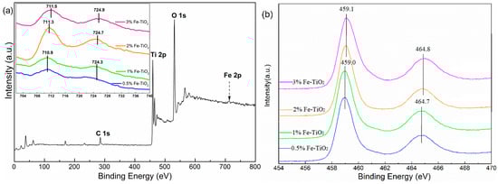 In addition, XPS measurements were conducted to further ascertain the chemical status of the surface of the Fe-doped TiO2 nanoparticles. The corresponding results are presented in Figure 7. As shown in Figure 7a, the fully scanned spectra demonstrated the existence of Ti, O, and Fe elements, as well as C as the reference (C 1s calibrated with a fixed value of 284.8 eV). According to the core level spectra of Fe 2p (given in Figure 7a as inset), the presence of Fe 2p3/2 and Fe 2p1/2 components in the 0.5% Fe-TiO2 and 1% Fe-TiO2 samples at the binding energy (B.E.) positions of 710.9 eV and 724.3 eV were consistent with Fe3+ in an interactive Ti-O-Fe species [33]. A higher shift of the binding energies of Fe 2p3/2 and Fe 2p1/2 could be observed with a further increase in Fe concentration, and this phenomenon was caused by the existence of the adsorbed Fe3+ dopant on the surface of the TiO2 [34]. The existence of Fe3+ on the TiO2 surface was likely to increase the number of available adsorption sites and lower the surface desorption energy [34,35]. A slight shift was also observed in the presence of Ti 2p3/2 and Ti 2p1/2 when the Fe-doped concentration exceeded 2 mol %, and all peaks regarding Ti 2p indicated that the Ti elements in the samples were in agreement with the values of Ti4+.