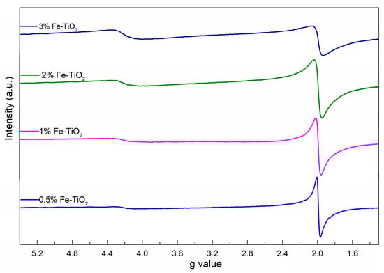 To further investigate the lattice site occupancy around the iron ion in the TiO2 host, electron paramagnetic resonance (EPR) experiments of the iron-loaded TiO2 samples were conducted and the results are presented in Figure 8. The EPR signals observed at g = 1.99 and g = 4.22 were attributed to Fe3+ substituted for Ti4+ in the matrix of TiO2 and to the substitutional incorporation of isolated iron cations dispersed on the TiO2 surface, respectively [27,36,37]. According to the standard Kroger–Vink equation, the acceptor-type Fe3+ dopant in the TiO2 lattice could act as defective sites (Ti) and generate oxygen vacancies () [38,39].