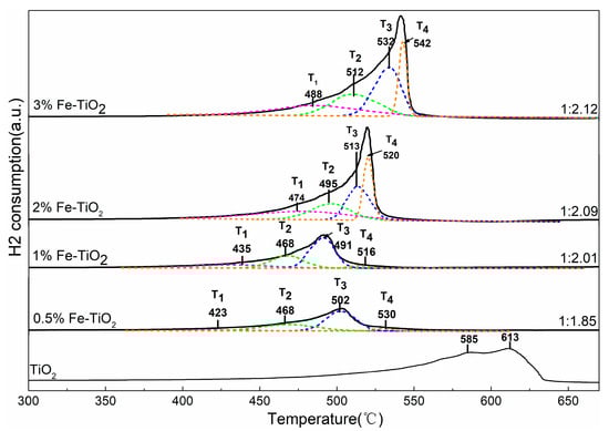 To investigate the reducibility behaviour of the bare and Fe-supported TiO2, a series of H2-TPR experiments were conducted and the results are shown in Figure 9. It can be seen that, in the pure TiO2 sample, a broad signal was presented ranging from 500 °C to 650 °C, and the two reduction peaks located at 585 °C and 613 °C can be ascribed to the surface oxygen and lattice oxygen due to Ti4+ to Ti3+ [40]. When Fe was incorporated into the TiO2 support, a distinct overlapped peak shifted to the lower temperature range (400–565 °C). Meanwhile, the peak intensity showed a significant increase as the Fe-doped concentration increased from 0.5% to 2%, and weak growth could be observed with a further increase in Fe-doped concentration. These results indicate that the integration of Fe with the TiO2 nanoparticle could enhance the oxidative ability of the TiO2. To better understand the detailed reduction properties of Fe species, a peak-fitting process was performed according to the method proposed by Liu et al. [41]. As shown in Figure 9, all of the Fe-doped TiO2 reduction peaks can be divided into four sub-bands and denominated as T1, T2, T3, and T4. The sub-band T1 and sub-bands T2–T4 are assigned to the surface oxygen and lattice oxygen, respectively [42]. Specially, the T2, T3, and T4 bands correspond to the progressive reduction process of the Fe ion, i.e., Fe3+-O-Ti→Fe2+/3+-O-Ti→Fe2+-O-Ti→Fe0 [43]. The area ratio values of T1/(T2 + T3) were all below 1:2, indicating that the Fe3+-O-Ti has been really converted into Fe0 in the T3–T4 process. It is worth mentioning that the area ratio values of T1/(T2 + T3) decreased with an increase in Fe-doped concentration, and this phenomenon should be attributed to the fact that an increase in Fe-doped concentration facilitates the enrichment of isolated Fe3+ on the surface of TiO2 (hereafter denoted as Fe3+surface). The results are consistent with the above EPR analysis.