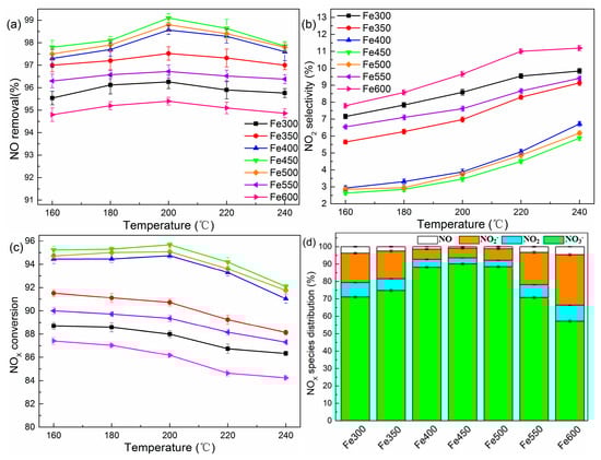(a–d) Removal efficiencies of NOX over Fe/TiO2 treated at different calcination temperatures. Conditions: H2O2/NO molar ratio: 12:1; GHSV: 60,000 h−1.