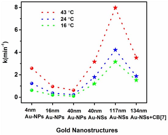 | Nanoparticles | 16 °C | 24 °C | 43 °C | Ea (kJ/mol) | |||