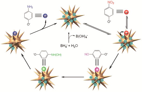 - De Oliveira, F.M.; de Araújo Nascimento, L.R.B.; Calado, C.M.S.; Meneghetti, M.R.; da Silva, M.G.A. Aqueous-phase catalytic chemical reduction of p-nitrophenol employing soluble gold nanoparticles with different shapes. Catalysts 2016, 6, 215. [Google Scholar] [CrossRef]