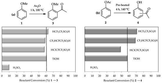 Comparison of sulfuric acid and various perfluorinated sulfonic acids used as catalysts for (a) the acylation of anisole 1; and (b) the Fries rearrangement of phenyl acetate 2. Data from [15]. Dashed lines indicate the reactant conversion (%) of the reaction utilized by TfOH.