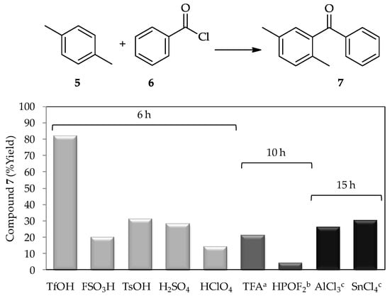 A study in 1972 using a low proportion of TfOH (~1 wt %) for the acylation of p-xylene 5 with benzoyl chloride 6 [3] found that this acid produced a higher yield of product 7 in comparison with other tested catalysts, including the conventional catalyst AlCl3 (Figure 3). Since then, the catalytic activity of TfOH has been extensively studied. In recent decades, research into TfOH not only focused on determining its optimal proportion for high efficiency acylations, but also in broadening the utilization of vast substrates, which contribute to new synthetic pathways, and the comprehensive study of suitable reaction conditions to optimize its application exploitation. For example, sterically hindered aromatic ketones and carboxylic acids can undergo either protodeacylation or decarboxylation, which are typically accompanied by side reactions in the presence of TfOH (at 110 °C) [17]. As the direct mechanism of C-acylation is identical to that of other reactions, there is a need to examine the selection of aromatic compounds used in these reactions [18]. A summary of the general characteristics of the TfOH catalytic system for C-acylation in this review is expected to discover excellent findings for TfOH catalytic activity in the future.