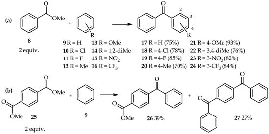 A typical definition of the intermolecular C-acylation is the addition of acyl groups to aromatic derivatives, which is conducted by an activator. Conventional acylation includes the use of simple arenes (both electron-rich and electron-poor) such as benzene, toluene, and xylene, which act as acyl acceptors, as well as typical acyl donors such as acyl chloride, carboxylic anhydride, esters, and carboxylic acid. The TfOH catalytic system has made the exploration of different acyl donors more feasible for C-acylation, thus increasing the number of potential donors for this reaction. Direct C-acylation of aromatic compounds using benzoic acid esters is extending this exploration series. At 85 °C, excess TfOH (5 equiv.) has been used for direct C-acylation of methyl benzoate 8 (2 equiv.) and aromatic derivatives 9–16, thus forming the benzophenone derivatives 17–24 [19]. In this reaction, no further electrophilic reaction of benzophenones with the aromatics was observed (Scheme 1a). Even highly deactivated nitrobenzene 15 and benzotrifluoride 16 acted as acyl acceptors, affording the corresponding three-substituted benzophenones 23 and 24 in high yield. Furthermore, the TfOH system can also catalyze the acylation of benzene 9 with diesters such as 1,4-dimethyl terephthalate 25, which results in a mixture containing the major products 4-benzoyl methyl benzoate 26 and 1,4-dibenzoyl benzene 27, under similar reaction conditions (i.e., reaction for 8 h) (Scheme 1b).