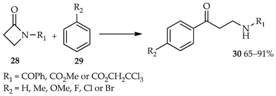 Efficient catalysis of reactions involving esters as acyl donors by using TfOH have led to the use of TfOH for the synthesis of β-amino aryl ketone derivatives from the acyl donors β-lactams (28) [20,21]. The TfOH-catalyzed reaction between β-lactams 28 and arenes 29 produces the desired β-amino aryl ketone derivatives 30 in moderate to high yields (Scheme 2). Meanwhile, no reaction was observed at room temperature using other common catalysts for the Friedel–Crafts acylation, such as AlCl3, methanesulfonic acid (MSA), trifluoroacetic acid (TFA), BF3·OEt2, or SnCl2. Reflux conditions did not produce the desired β-amino aryl ketone compounds; therefore, utilization of TfOH for this reaction at room temperature is preferred.