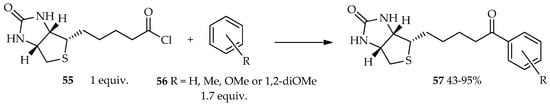 The TfOH catalytic system has been of interest because of its two properties that can enhance the reaction’s efficiency: (1) a solvent-free reaction that can be an alternative environment-friendly organic synthetic pathway; (2) a mild conditions, which are advantageous to reactions of valuable heat-sensitive substrates. For many years, the biotin–(strept)avidin system has been widely used for various applications. Biotin is a complex derivative of valeric acid that possesses a high binding affinity to avidin (a protein found in egg white) and streptavidin (a protein found in Streptomyces avidinni) [35]. Previously, mixed anhydride generated in situ from biotin using the TfOH/TFAA catalytic system was reported to react with electron-rich acyl acceptors (ferrocene, ruthenocene, and pyrene) [33]. The selected arenes are very reactive in the Friedel–Crafts acylation, thus providing an opportunity for using biotin in these reactions. At present, our laboratory can use neat TfOH for acylation reaction using acid chloride of biotin 55 as an acyl donor. It is estimated that the high reactivity to acylation, which is the key role in this reaction, is not only due to the reactive skeleton of the acyl acceptor, but also the proper selection of the acyl donor. As a result, the acid chloride of biotin 55 readily reacts with the less-electron-rich acyl acceptor 56, forming acylated product 57 in the presence of neat TfOH (Scheme 3) [36]. From the point of view of fundamental biological activity with the replacement of an avidin specific bound compound, it suggests that aromatic derivatives of acylated biotin have enough biological activity against the biotin skeleton. Furthermore, the resulting aromatic derivatives of acylated biotin can possibly be explored for functional bioanalysis-tag in the future.