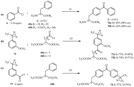 The use of the (3-trifluoromethyl)phenyldiazirinyl (TPD) group as a photoreactive group in photoaffinity labeling confers selectivity for probe activation without damaging the peptides and proteins under radiation of 350 nm wavelength [48,52,53]. The strategy for the synthesis of homophenylalanine or bis-homophenylalanine containing TPD moiety starts with the introduction of a TPD moiety in anisole 71 into an aspartic acid analogue 66a [48] or a glutamic acid analogue 66b [46] (Scheme 6b). In this reaction, high temperatures can result in the decomposition of the starting material 71 due to the thermolability of TPD under strongly acidic conditions [50,54]. A temperature of 0 °C is optimal for synthesis using these valuable heat-sensitive aromatic compounds. Furthermore, the reaction between 71 and 66a did not proceed when neat TiCl4 was used, whereas utilization of TfOH afforded the acylated product 72a up to a 68% yield. The acylated products 72 are intermediates that can be reduced and deprotected to produce the photoaffinity labeling probes based on homophenylalanine or bis-homophenylalanine derivatives. The mild conditions offered by TfOH catalysis can also be applied to construct not only one, but also two kinds of photophores to introduce in one probe. The strategy for this synthesis is the direct acylation of benzoyl chloride containing TPD 73 and N-protected phenylalanine 69b at room temperature (Scheme 6c). Enhancement of this reaction was evidenced by no decomposition of the diazirine moiety (product 74); and no loss of optical purity was observed after the deprotection of product 74 by NaOH (99% ee).