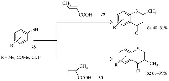 A bifunctional substrate for both the acylation and alkylation of aromatic compounds draws a lot of attention for the proposes of useful cyclic aromatic ketones formation [55]. The process, known as cyclic acylalkylation, can be formed by the TfOH catalytic system under forced conditions. A high temperature and excess catalyst suppresses the competitive intermolecular reaction to make the cyclization possible. The reaction between aromatics 75 with unsaturated carboxylic acids 76 catalyzed by TfOH has been found to produce 1-indanone (n = 0) or 1-tetralone (n = 1) forms of 77 (Scheme 7) [55]. The high temperature (at 80 °C) contributes to the induction of the cyclic acylalkylation in this reaction. In comparison, a low temperature (at 20 °C) favors the multiple terminals acylation of the alkyne moiety and carboxylic moiety of unsaturated carboxylic acid 76. Moreover, thiochroman-4-ones, which are valuable synthons and important precursors in organic syntheses, are generally synthesized via a multistep reaction; a one-pot approach was uncovered through the use of TfOH [56]. One-pot cyclic acylalkylation of thiophenols 78 and crotonic or methacrylic acid (79 or 80) under microwave irradiation and in the presence of excess TfOH gives good yields of thiochroman-4-ones 81 and 82 (Scheme 8).