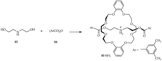 Rotaxanes are molecules composed of a linear dumbbell-shaped substituent flanked by one or more macrocycles. For many years, chemists have been intrigued by the challenge of synthesizing these mechanically interlocked molecules; traditional synthetic methods can only produce poor yields of rotaxanes [58]. The selective O-acylation of diethanolamine 83 by aromatic acid anhydride 84 was carried out in the presence of 1.5 equiv. of TfOH and dibenzo-24-crown-8 to afford [2]rotaxane 85 at 0 °C (Scheme 9). The use of TFA and MSA did not allow the formation of 85 and only formed the esterification product from starting material 83. Relative to the acidity of other catalysts, TfOH is sufficient for the protection of the amino group via protonation and esterification. Thus, the TfOH catalytic system enables high production yields of 85 at low temperature [59].