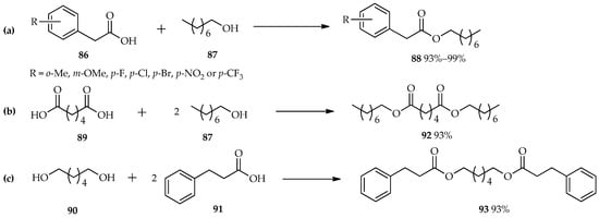 TfOH as an efficient catalyst in the esterification reaction was also studied by Shibata et al. [60]. Reactions between various benzoic acid derivatives (86) and octan-1-ol (87) were carried out using a catalytic amount of TfOH in 1,1,1,3,3-pentafluorobutane as a solvent. The unique properties of TfOH make it a more active catalyst than sulfonic acid; thus, 0.2 mol % of TfOH is sufficient for the excellent conversion of the reactants to 88 (Scheme 10a). This condition is also suitable for the O-acylation of either the diacid 89 with an alcohol 87 (Scheme 10b), or the diol 90 with carboxylic acid 91 (Scheme 10c). Both of these reactants were converted to their diesters, 92 or 93, respectively, with excellent yields without the need for extended reaction times.