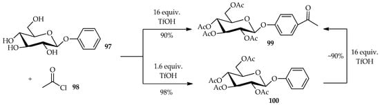 The derivatization of O- and C-arylglycoside is hampered by the low solubility of the unprotected aromatic glycosides in the reaction medium and the competitive deglycosidation under acidic conditions for O-glycosides. TfOH was found to easily dissolve the carbohydrates without causing their decomposition. The low solubility of unprotected aromatic glycosides can be overcome by using TfOH as a Friedel–Crafts acylation promoter. This technique can be extended to other reactions such as direct acylation of O- and C-arylglycosides. The Friedel–Crafts acylation of the aromatic moiety and O-acylation of the glucose moiety of aryl glycoside is dependent upon the proportion of TfOH used [63]. The reaction of phenyl-β-d-glucoside 97 with acetyl chloride 98 in the presence of excess TfOH (16 equiv.) can result in the production of 98 with good yield (Scheme 11). In this case, the excess TfOH promotes not only the Friedel–Crafts acylation of the aromatic moiety, but also the O-acylation of the glucose moiety. Treatment of 97 with 1.6 equiv. of TfOH, produces only the per-O-acetylated compound 100, indicating that the O-acylation is faster than the Friedel–Crafts acylation. This result is supported by the re-treatment of 100 with a large amount of TfOH, which afforded an ~90% yield of the Friedel–Crafts product 99.