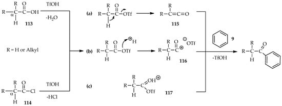 Even though catalytic amounts of TfOH are known to enable selective O- and/or C-acylation in organic solvents, the solubility of some substrates such as amino acids, which was previously mentioned above, should be taken into consideration. Selection of suitable conditions for these reactions is necessary, especially the reactions for optically active amino acids. Several plausible routes using various active species [65,66,67] for aromatic acylation exist (Scheme 15). The mixed carboxylic trifluoromethanesulfonic anhydride may be obtained by treatment of TfOH with acyl chloride [65] or carboxylic acid [66,67]. The acylation pathway for an acyl donor in the form of alkyl carboxylic acid 113 or acyl chloride 114 can produce several species. When mixed, carboxylic trifluoromethanesulfonic anhydride is deprotonated and ketene 115 may be formed (Scheme 15a). Next, if no proton is eliminated during the process, the dissociated acyl carbonium ion 116 seems more reliably formed. (Scheme 15b). Another possible species is the protonated carbonyl of the mixed anhydride 117 (Scheme 15c), in which the detailed spectroscopy has been studied. Ascertaining which intermediate has formed is a crucial step in preventing the formation of a racemic adduct during acylation. One of the advantages of TfOH potential features are the 2H-labelling experiments by using deuterated TfOH (TfOD). The use of TfOD as a catalyst, solvent, and source of deuterium in hydrogen/deuterium (H/D) exchange in the direct C-acylation of aromatic substrates provides insight into the mechanisms of these reactions. Deuterium incorporation at the α-proton of carbonyl during TfOD-catalyzed reaction between acyl donor and substrate indicates the formation of the intermediate ketene 115. Otherwise, non-deuterium incorporation at the α-proton of carbonyl indicates formation of either the acyl cabonium ion 116 or protonated carbonyl of mixed anhydride 117.