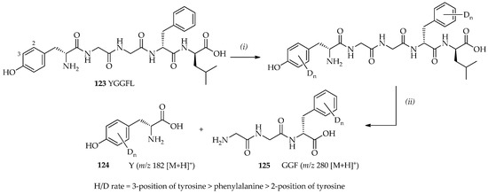TfOD-catalyzed H/D exchange with leucine enkephalin (Tyr-Gly-Gly-Phe-Leu, YGGFL) 123 and its characterization by digestion with chymotrypsin. Reagents and conditions: (i) TfOD, r.t., 9 h; (ii) chymotrypsin [71].